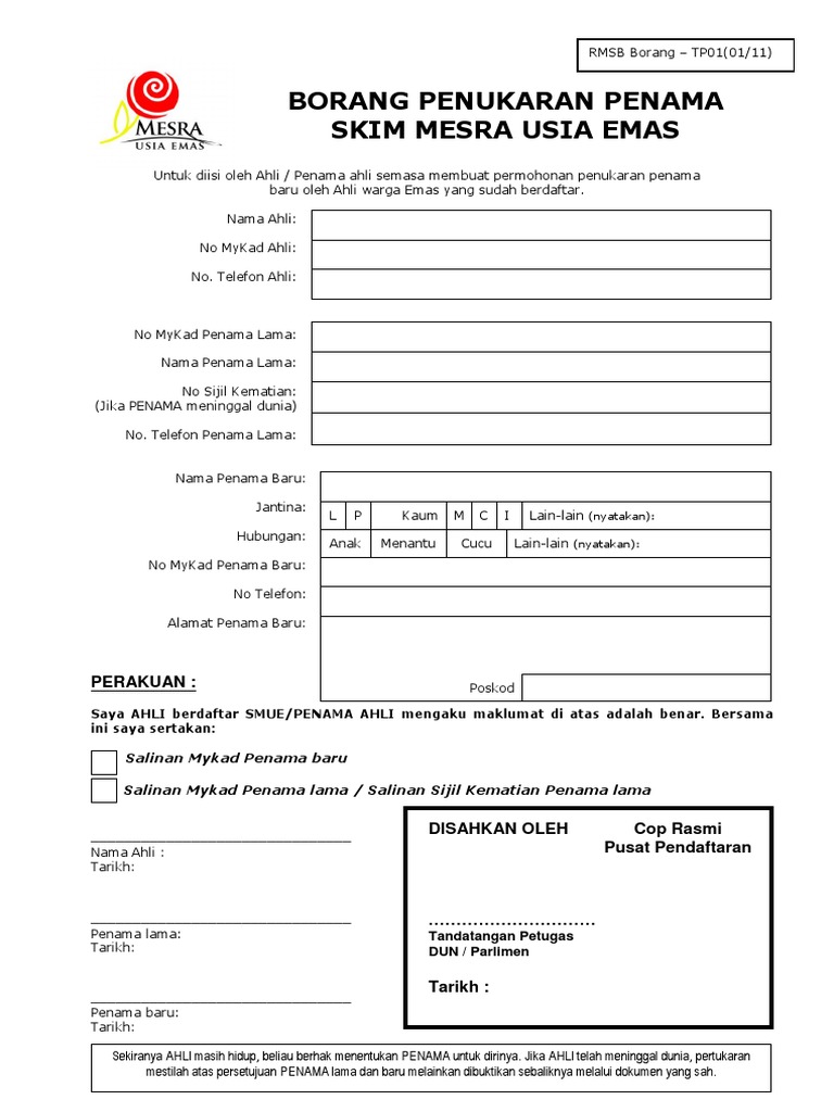 Borang Penukaran Penama Skim Mesra Usia Emas Perakuan