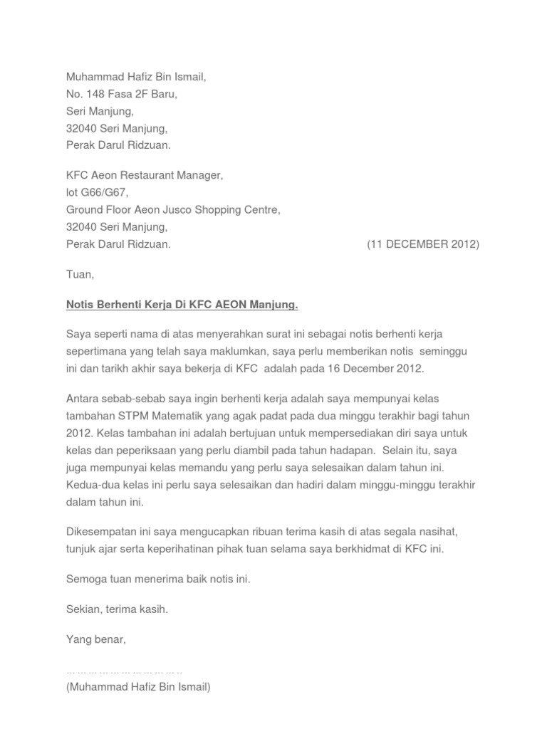 Contoh Surat Rasmi Berhenti Kerja Kfc Resepi Book H