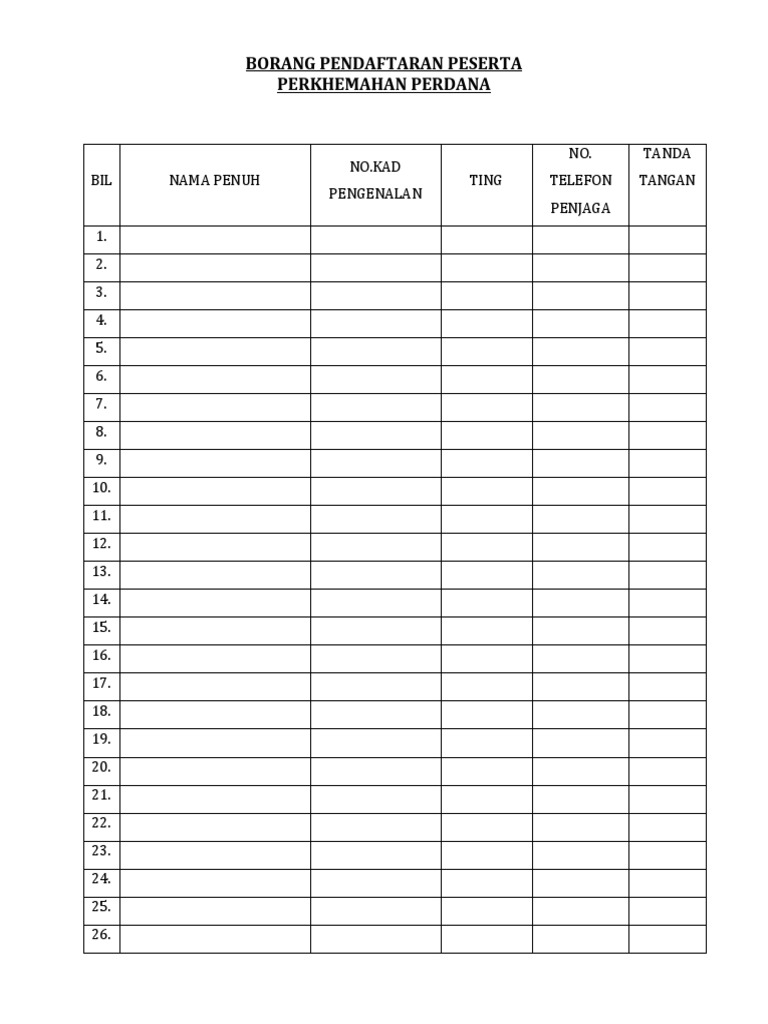 Borang Pendaftaran Peserta Perkhemahan Perdana Bil Nama Penuh No Kad Pengenalan Ting No Telefon Penjaga Tanda Tangan