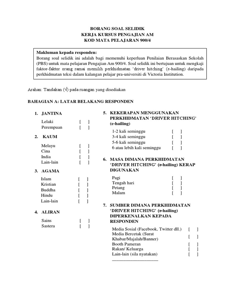 Doc Borang Soal Selidik Kerja Kursus Pengajian Am Kod Mata Pelajaran 900 4 Bahagian A Data Demografi Responden Chrys Annie Rayvious Academia Edu