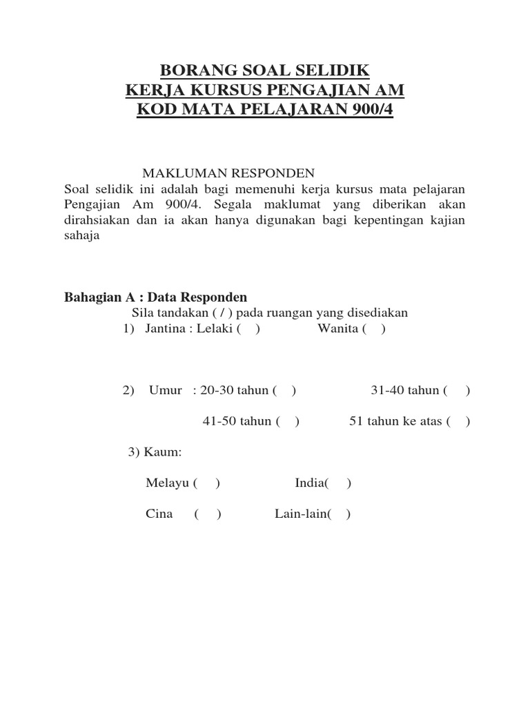 Borang Soal Selidik Docx Kolej Tingkatan Enam Sri Istana Borang Soal Selidik Kerja Kursus Pengajian Am Makluman Kepada Responden Soal Selidik Ini Course Hero