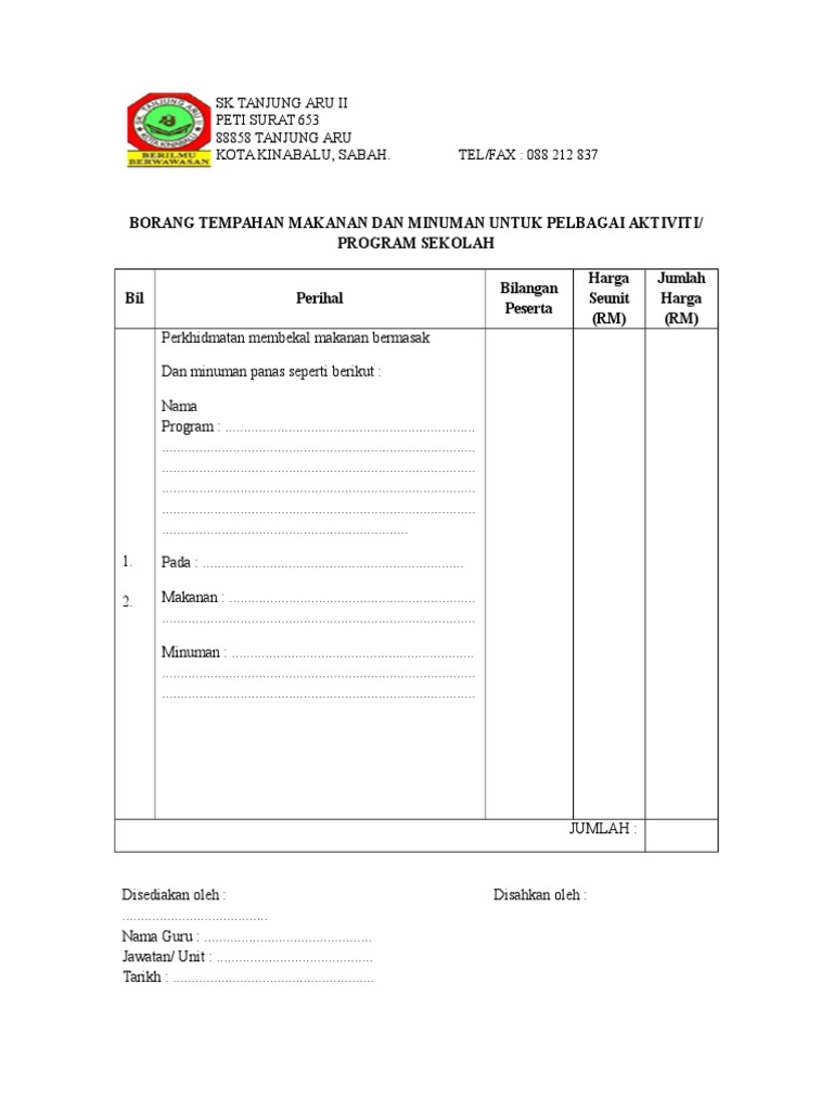 Borang Tempahan Makanan Dan Minuman
