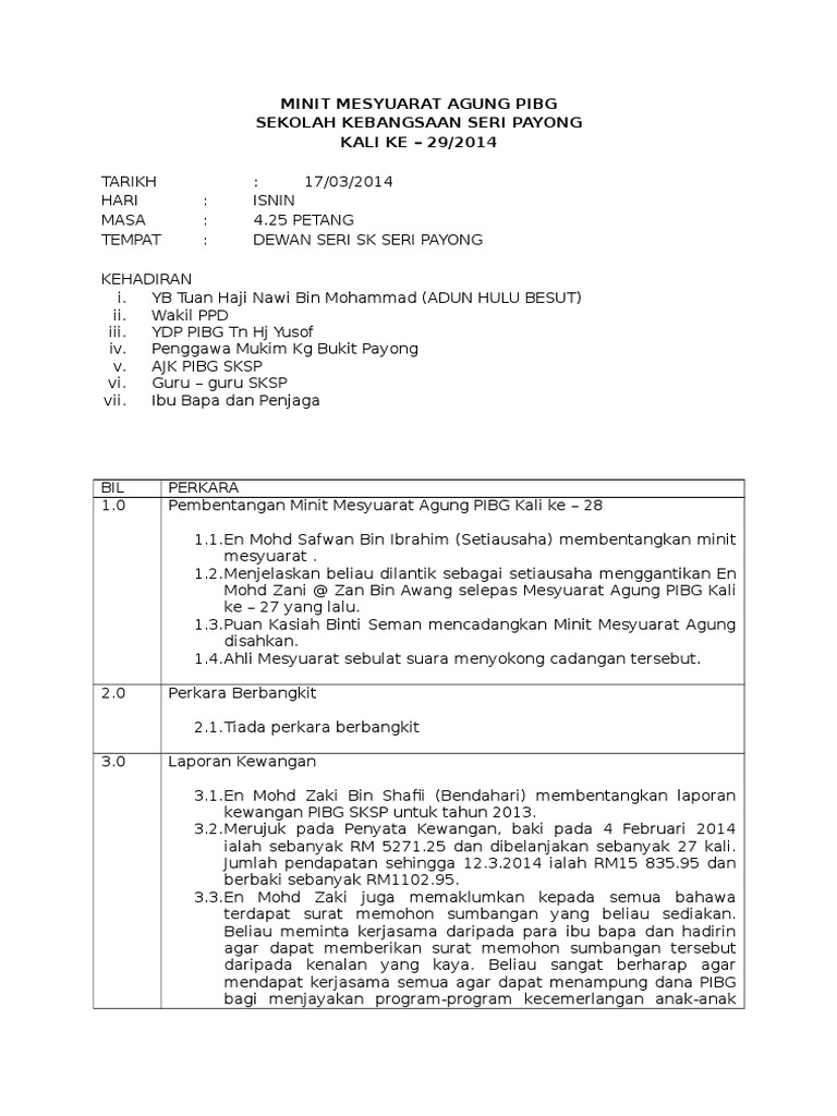 Doc Minit Mesyuarat Agung Pibg Sk Desa Petaling Kali Ke 14 Sesi 2015 2016 Iz Izyanti Academia Edu