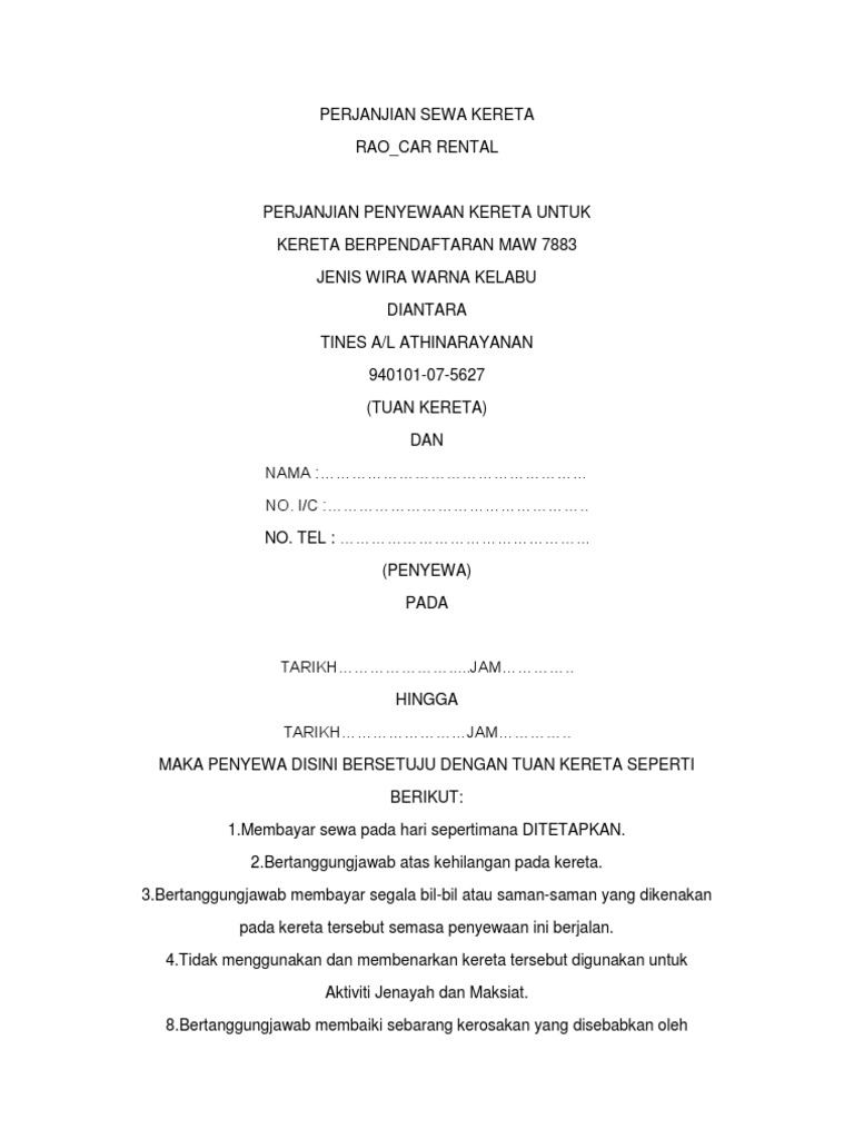Contoh Surat Perjanjian Sewa Kereta Doc