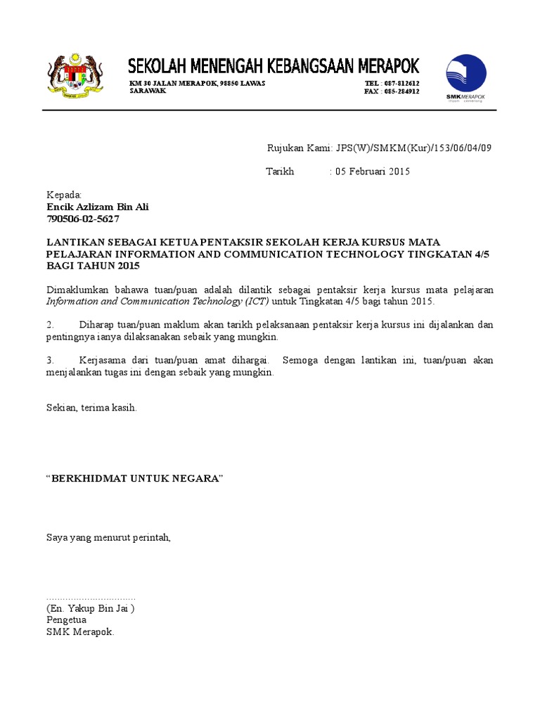 Contoh Surat Perlantikan Rasmi