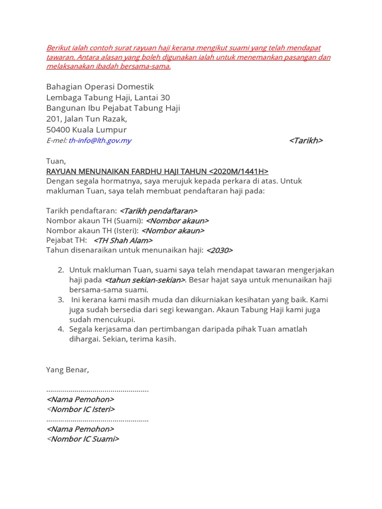 Contoh Surat Rayuan Haji Mengikut Suami