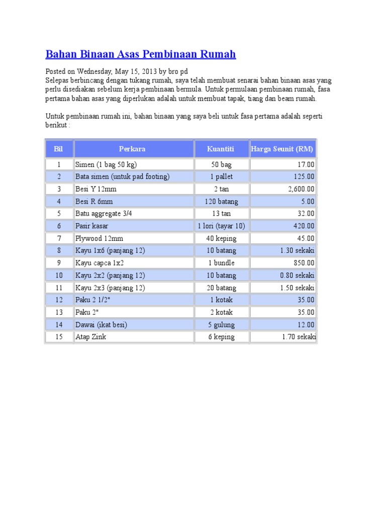 Bahan Asas Untuk Bina Rumah Saiz Sederhana Borak Qs