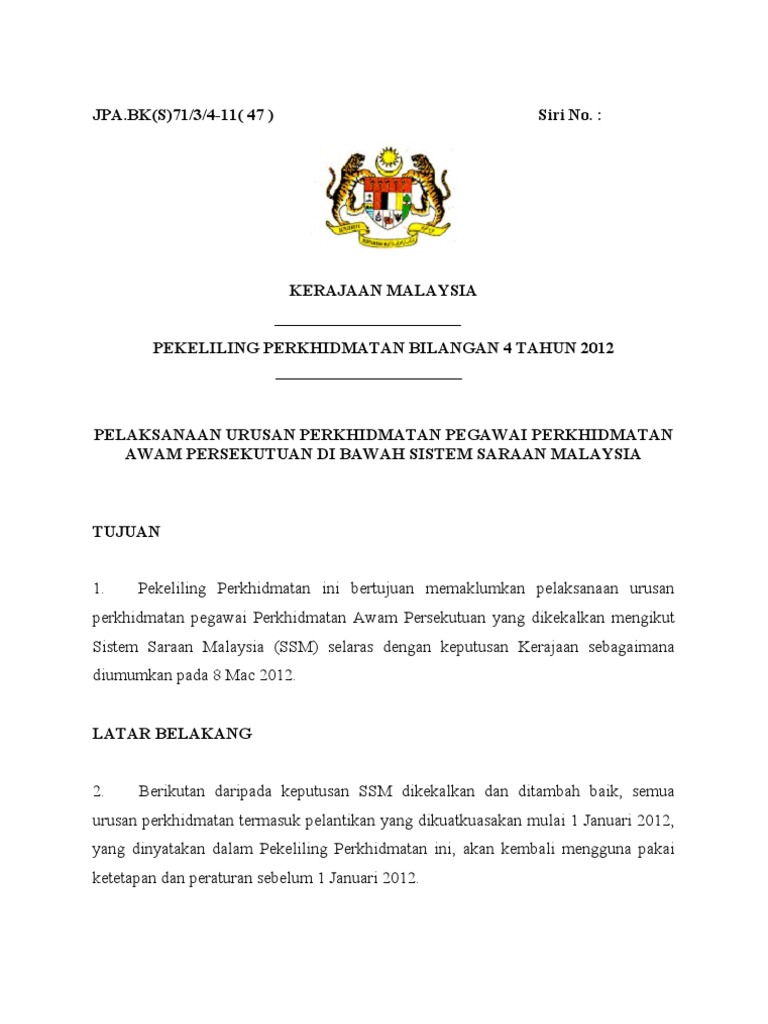 Pekeliling Perkhidmatan Bil 4 2012 Pelaksanaan Urusan Perkhidmatan Pegawai Perkhidmatan Awam Persekutuan Di Bawah Sistem Saraan Malaysia