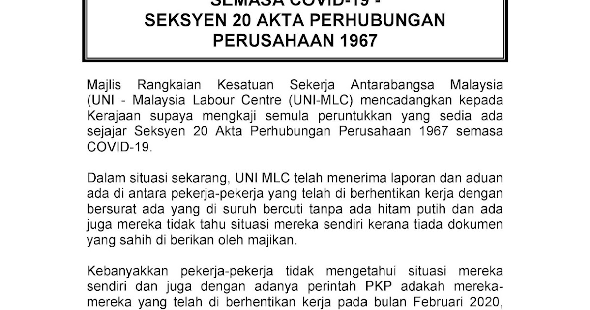 Uni Malaysia Labour Centre Siaran Akhbar Pemberhentian Pekerja Semasa Covid 19 Seksyen 20 Akta Perhubungan Perusahaan 1967